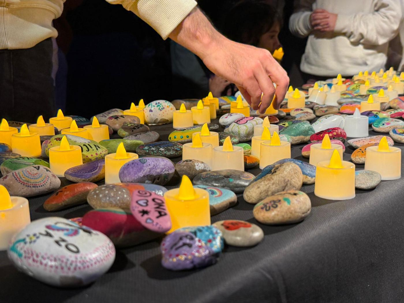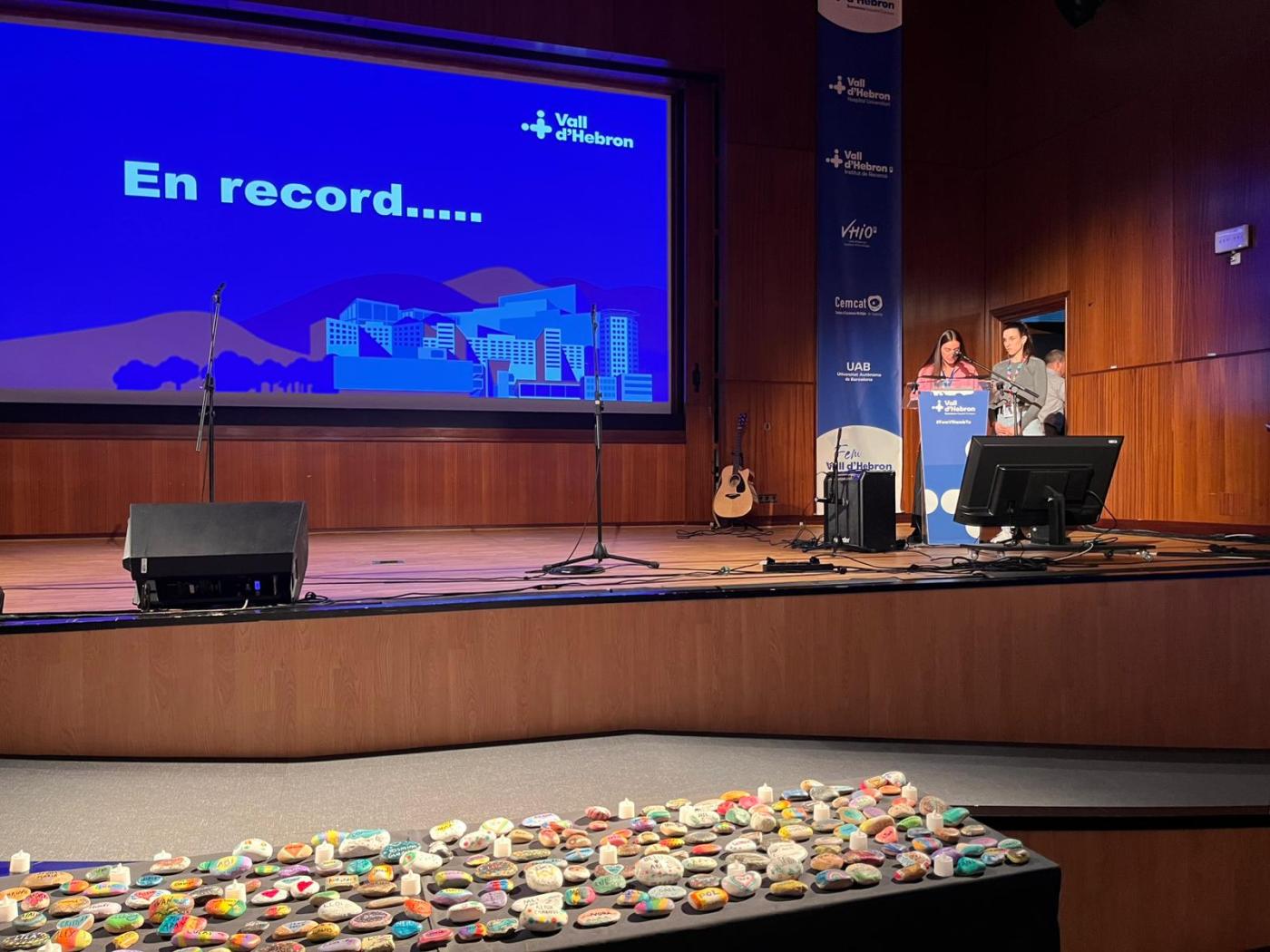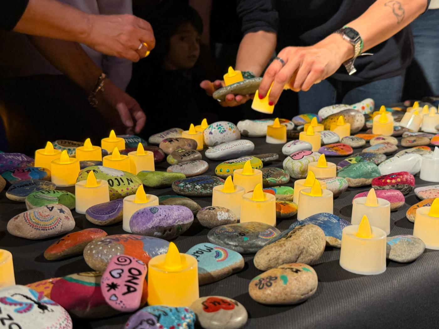 El primer memorial va reunir famílies, professionals i cuidadors a la sala d’actes del pavelló docent, que es va quedar petita. Durant l’acte, es van col·locar sobre un taulell al peu de l’escenari 298 pedres, una per cada infant, amb els seus noms. L’Eva acostumava a pintar còdols de la platja amb el seu fill i amb l’ajuda d’altres mares i familiars van anar reunint pedres per pintar-les al llarg d’unes trobades que van crear xarxa. Cadascuna tenia un dibuix únic, com úniques van ser les seves vides. Durant l’acte, al costat de cada pedra, les famílies van encendre una espelma en un gest íntim i respectuós que cadascuna va fer al seu ritme. En silenci, però acompanyades de la música de la coral Sadacor, formada per famílies de l’escola Sadako i dirigida per Andreu Rifé, actor i autor d’una de les cançons de la banda sonora de “Polseres Vermelles”: “Fil de LLum”. La coral va interpretar diverses peces en un ambient de recolliment, entre elles “La gent que estimo” d’Oques Grasses. “No pretenem consolar, només col·locar una mica de bellesa al costat del buit”, va compartir la coral, entre qui hi havia una pacient de Vall d’Hebron, la Cèlia Sáez, que per un fil de casualitats, va fer d’enllaç entre uns i altres. L’equip d’acompanyament del dol, la Carla Cusó, i les dues psicòlogues, la Laura Ramon i l’Anna Barredo van posar veu a l’acte. En el seu parlament, van agrair a totes les mares, germanes i familiars que “amb les seves mans han donat vida a les pedres que simbolitzen a cada nen i nena convertint-les en memòries que perduren”. També van tenir unes paraules per a la mare que va tenir el detall de cosir uns cors de llana que es van entregar a les famílies. Així com a la coral i a totes les persones que hi ha darrere els noms gravat en pedres, “ho han estat tot i seran per sempre en nosaltres”.