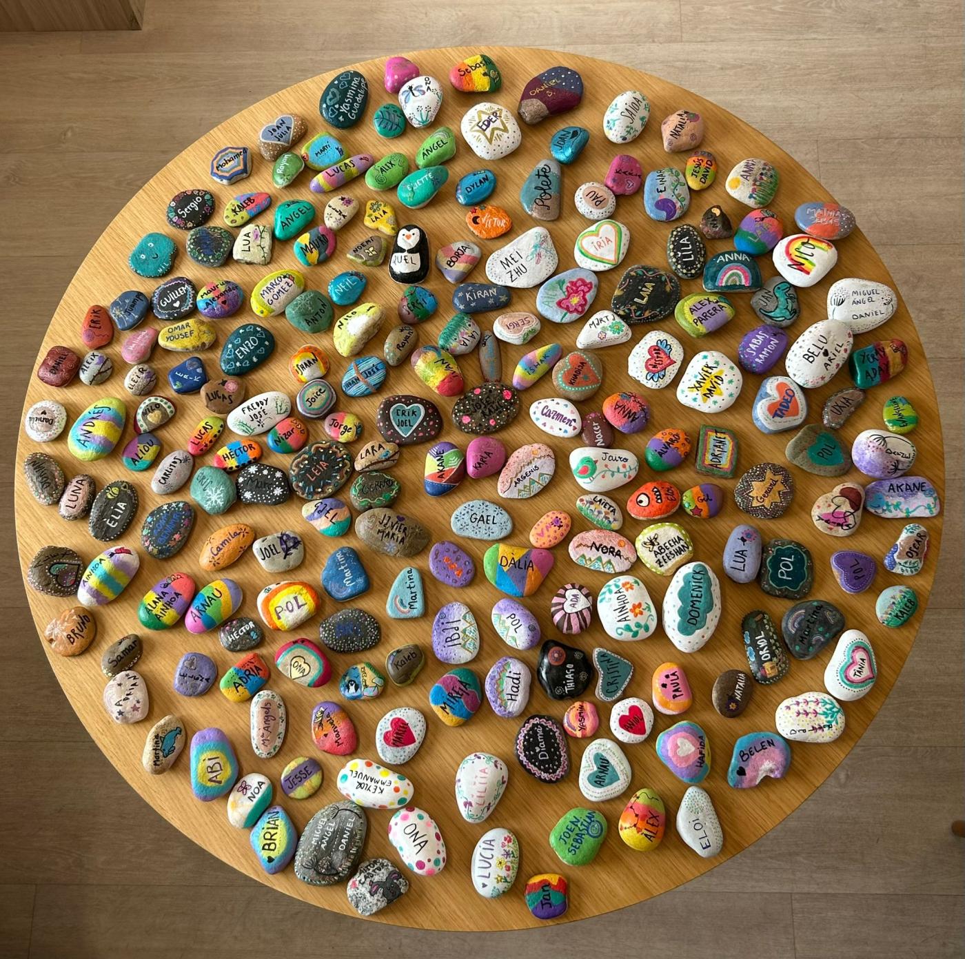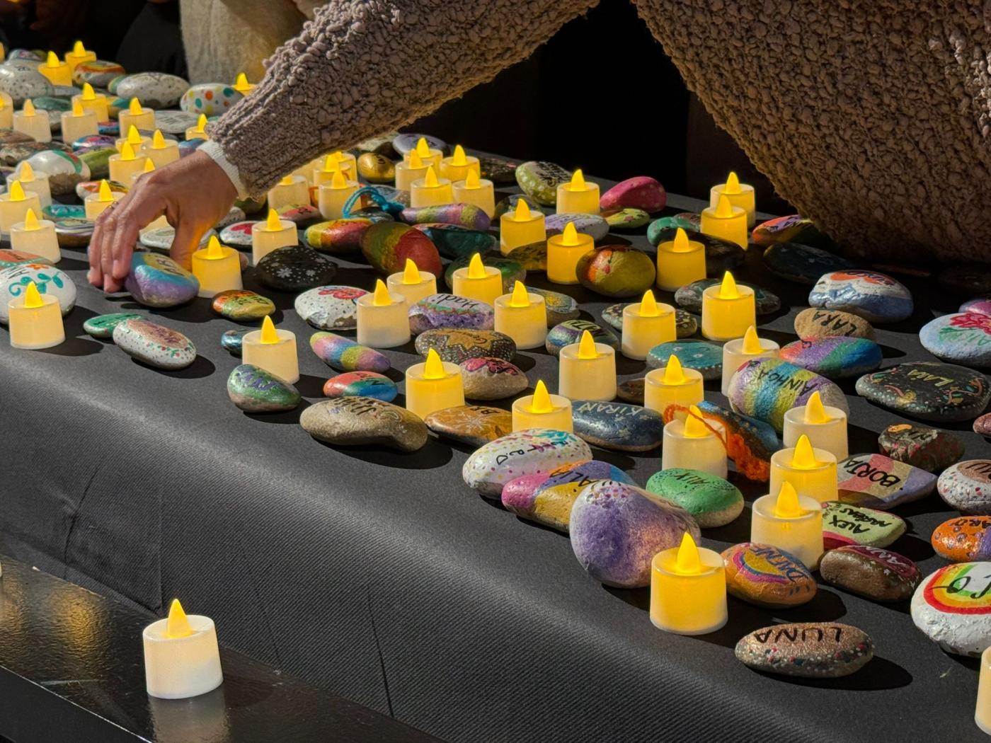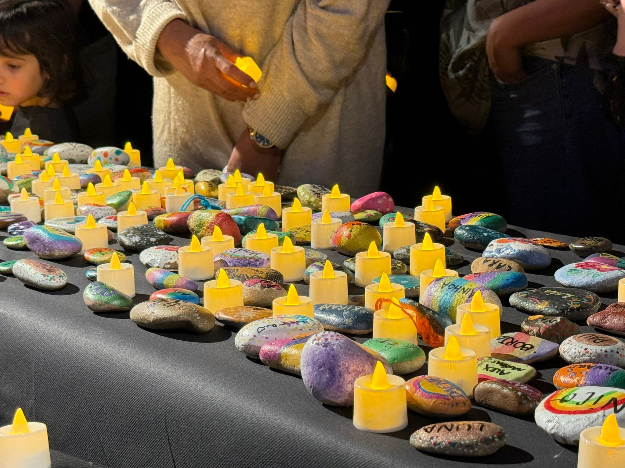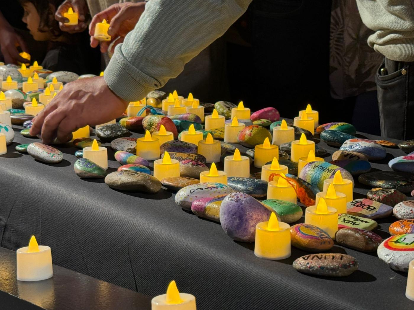 El primer memorial va reunir famílies, professionals i cuidadors a la sala d’actes del pavelló docent, que es va quedar petita. Durant l’acte, es van col·locar sobre un taulell al peu de l’escenari 298 pedres, una per cada infant, amb els seus noms. L’Eva acostumava a pintar còdols de la platja amb el seu fill i amb l’ajuda d’altres mares i familiars van anar reunint pedres per pintar-les al llarg d’unes trobades que van crear xarxa. Cadascuna tenia un dibuix únic, com úniques van ser les seves vides. Durant l’acte, al costat de cada pedra, les famílies van encendre una espelma en un gest íntim i respectuós que cadascuna va fer al seu ritme. En silenci, però acompanyades de la música de la coral Sadacor, formada per famílies de l’escola Sadako i dirigida per Andreu Rifé, actor i autor d’una de les cançons de la banda sonora de “Polseres Vermelles”: “Fil de LLum”. La coral va interpretar diverses peces en un ambient de recolliment, entre elles “La gent que estimo” d’Oques Grasses. “No pretenem consolar, només col·locar una mica de bellesa al costat del buit”, va compartir la coral, entre qui hi havia una pacient de Vall d’Hebron, la Cèlia Sáez, que per un fil de casualitats, va fer d’enllaç entre uns i altres. L’equip d’acompanyament del dol, la Carla Cusó, i les dues psicòlogues, la Laura Ramon i l’Anna Barredo van posar veu a l’acte. En el seu parlament, van agrair a totes les mares, germanes i familiars que “amb les seves mans han donat vida a les pedres que simbolitzen a cada nen i nena convertint-les en memòries que perduren”. També van tenir unes paraules per a la mare que va tenir el detall de cosir uns cors de llana que es van entregar a les famílies. Així com a la coral i a totes les persones que hi ha darrere els noms gravat en pedres, “ho han estat tot i seran per sempre en nosaltres”.