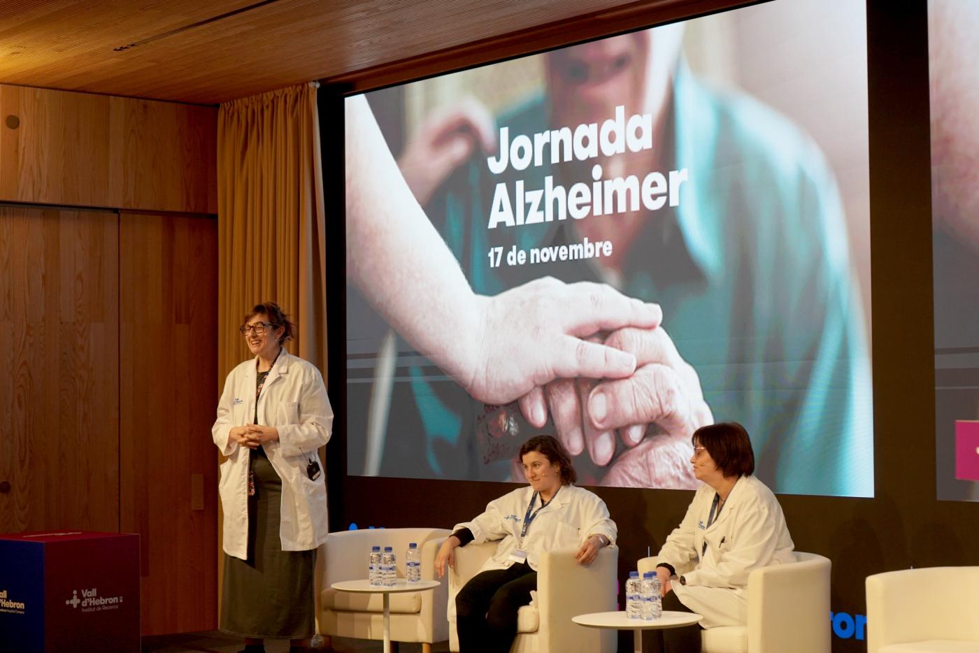 El primer bloc, moderat per la Dra. Darly Giraldo, neuròloga de l’Hospital Universitari Vall d’Hebron, va centrar-se en l’estat actual del diagnòstic i dels tractaments. El Dr. Antonio Palasi i la Dra. Olga Maisterra, neuròlegs de Vall d’Hebron i membres del grup de Malalties Neurovasculars del VHIR, van repassar l’evolució històrica de la malaltia i les eines diagnòstiques i terapèutiques que existeixen actualment. Des de la descripció del primer cas de la malaltia a inicis del segle XX fins a l’actualitat, el Dr. Palasí va explicar la importància de l’estudi de les alteracions histològiques al cervell dels pacients per entendre l’Alzheimer i dels biomarcadors per aconseguir un diagnòstic acurat. Va destacar que la demència no és una malaltia com a tal, sinó un símptoma, de la qual l’Alzheimer és la causa més freqüent.