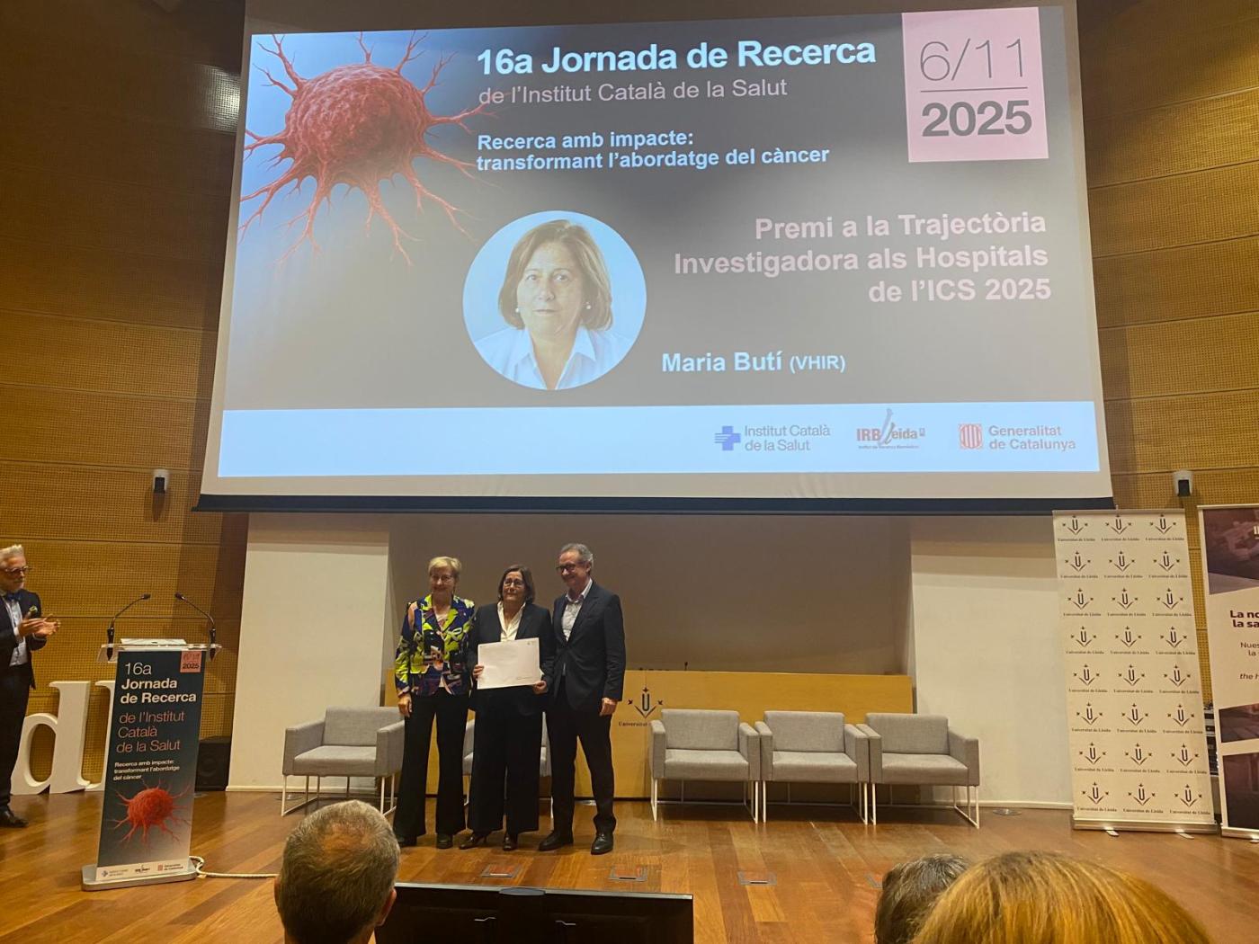El Premio a la Trayectoria Investigadora en los Hospitales del ICS se convoca para profesionales que hayan contribuido de forma significativa al desarrollo de la investigación en ciencias de la salud en el ámbito de la atención hospitalaria del ICS, con una actividad de reconocido nivel científico. La Dra. Maria Buti, consultora sénior del Servicio de Hepatología del Hospital Universitario Vall d’Hebron, investigadora principal del grupo de Enfermedades Hepáticas del VHIR, catedrática de la Universidad Autónoma de Barcelona (UAB) e investigadora del área de Enfermedades Hepáticas y Digestivas del CIBER (CIBERehd), ha sido premiada este año.