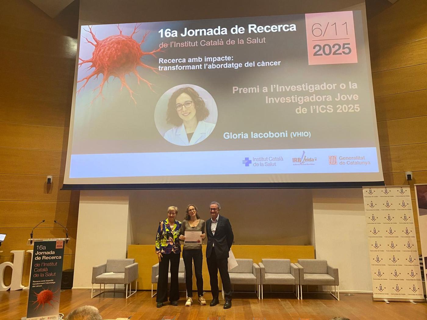El Premio al Investigador/a Joven se atorga a profesionales menores de 40 años que hayan contribuido de forma significativa al desarrollo de la investigación en ciencias de la salud en el ámbito del ICS con una actividad de reconocido nivel científico. Este año, la persona premiada ha sido la Dra. Gloria Iacoboni, adjunta del Servicio de Hematología del Hospital Universitario Vall d’Hebron y miembro del grupo de Hematología Experimental del Vall d'Hebron Instituto de Oncología (VHIO).