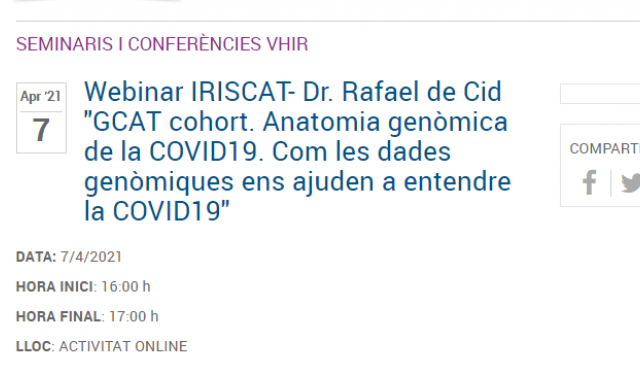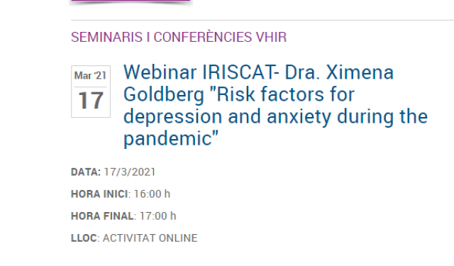 ¿Qué estás buscando? Buscar Búsquedas habituales: Servicios y unidades, Hospitalización, Profesionales, Consultas externas, Consejos de salud, Acreditaciones, Enfermedades, Pruebas diagnósticas, Tratamientos, Nacimiento de un hijo, Urgencias, Visitas a pacientes, Fulltext search Tipus de contingut Servicios y unidades Profesionales Enfermedades Consejos de Salud Salud y bienestar Pruebas Diagnósticas Tratamientos Noticias Actividades Centros - Cualquiera - Buscar Actividades Curso de instructores en simulación en Vall d'Hebron Actividades Exposició L'altra mirada de la recerca- Què hi ha al darrere de les imatges científiques? Exposició L’altra mirada de la recerca – cicle de xerrades Lloc: Sala cotxeres del Palau Robert (Passeig de Gràcia, 107, 08008 Barcelona) Dies: 2, 9, 16 i 23 de febrer Horari: de 18h a 19h Actividades Webinar VHIR - "Proyecto COPEDI-CAT" Dr. Toni Soriano CV: El Dr. Soriano obtuvo el grado de Doctor en Medicina por la Universidad de Barcelona en enero de 2017 con la tesis sobre la transmisión del VIH de madre a hijo y la influencia del factor migrante en la epidemiología del VIH en Catalunya durante un período de 15 años (2000- 2014). Es co Actividades Acogida profesionales Hospital Vall d’Hebron Edificio Garbí Acollida professionals Hospital Vall d’Hebron Edifici Garbí 1a Edició - 2 Febrer 2021 – 8 h 2a Edició - 3 Febrer 2021 – 8 h Sala d’Actes Pavelló Docent Conduce el acto: Montserrat Martínez. Adjun Actividades Webinar IRISCAT- Dra. Clara Montagut "Utilitat clínica de la biòpsia líquida en càncer colorectal" Vogelstein y colegas describieron hace más de 20 años un modelo de carcinogénesis colorrectal basado en un acúmulo de mutaciones somáticas de forma secuencial. Así pues, la presencia de mutaciones somáticas define la presencia de cáncer. Tradicionalmente, las mutaciones somáticas se determinan en Actividades Webinar IRISCAT- Dra. Laura Furlong "Coping with the gene-disease big data: The DisGeNET platform" One of the most pressing challenges in genomic medicine is to understand the impact of genomic variation in disease and drug response. The large-scale interrogation of the human genome has uncovered hundreds of thousands of disease-associated loci. However, the identification of variants of clini Actividades Webinar VHIR- Dr. Joan Seoane "LIF as a regulator of the innate immune response to antigens" I will discuss about the parallelisms of viral infection and cancer and how virus and tumors can use similar molecular mechanisms to evade the immune system of the host. I will talk about our research in the field of cancer and how we identified LIF as a potent immunosuppressor in the context of Actividades Webinar VHIR -Dr. Ricardo Pujol "Autoinmunidad órgano-específica 2021: Re-interpretación de la hipótesis de 1983 sobre el papel la expresión aberrante de HLA por las células endocrinas en la patogénesis de la respuesta autoinmune" En su inicio la investigación en las enfermedades autoinmunes se centró en la detección de auto-anticuerpos y sus correspondientes auto-antígenos, pero la existencia de una respuesta celular concomitante, aunque sospechada, no se podía estudiar. Sin embargo a partir del descubrimiento de la Actividades Webinar IRISCAT- Dr. Rafael de Cid "GCAT cohort. Anatomía genómica de la COVID19. Cómo los datos genómicos nos ayudan a entender la COVID19" El brote epidémico del SARS-CoV-2 ha puesto a prueba la sociedad y, en especial, la comunidad científica, en la que se han depositado todas las esperanzas de encontrar una solución rápida al problema. En poco tiempo hemos tenido que mostrar una gran creatividad y capacidad de trabajo global, y se Actividades Webinar IRISCAT- Dra. Ximena Goldberg "Risk factors for depression and anxiety during the pandemic" Depression was already the second leading cause of global burden of disease before the beginning of the COVID-19 pandemic almost one year ago. Mental health conditions were associated with global economic costs rising to U$S 1 trillion per year. These estimates are expected to further increase in Paginación Página anterior ‹‹ Página 243 Siguiente página ››
