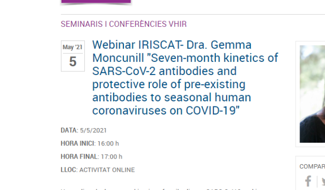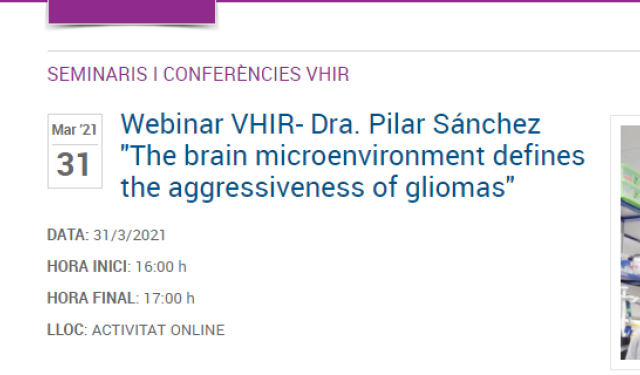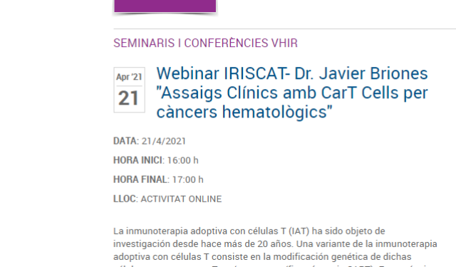 ¿Qué estás buscando? Buscar Búsquedas habituales: Servicios y unidades, Hospitalización, Profesionales, Consultas externas, Consejos de salud, Acreditaciones, Enfermedades, Pruebas diagnósticas, Tratamientos, Nacimiento de un hijo, Urgencias, Visitas a pacientes, Fulltext search Tipus de contingut Servicios y unidades Profesionales Enfermedades Consejos de Salud Salud y bienestar Pruebas Diagnósticas Tratamientos Noticias Actividades Centros - Cualquiera - Buscar Actividades Dia Mundial del Riñón. Semipresencial y Online 10:00 h Benvinguda per part del Dr. Roman, director Assistencial de l’Hospital Universit Actividades Webinar VHIR- Dra. Pilar Sánchez "The brain microenvironment defines the aggressiveness of gliomas" Cancer growth is driven by the complex interplay between tumor cells and their supportive microenvironment. However, this interaction is still not fully understood, especially for gliomas, which are very aggressive tumors growing in the complex brain milieu. Here, I will present some recent Actividades Webinar IRISCAT- Dra. Gemma Moncunill "Seven-month kinetics of SARS-CoV-2 antibodies and protective role of pre-existing antibodies to seasonal human coronaviruses on COVID-19" Unraveling the long-term kinetics of antibodies to SARS-CoV-2 and its determinants is essential to understand protective immunity to COVID-19 and devise effective surveillance strategies. In addition, understanding the extent of antibody cross-reactivity with other human coronaviruses (HCoV Actividades Webinar IRISCAT- Dr. Marie-Paule Kieny "COVID-19 vaccines: from the R&D race to mass vaccination" To date, multiple COVID-19 vaccines have received full registration or authorizations for emergency use and many countries have initiated vaccination campaigns. Through publication of results of Phase 1 and 3 clinical trials and of real-world effectiveness evaluation in a few countries, many of t Actividades Curso de referentes en simulación a los profesionales de Vall d'Hebron El objetivo de este curso fue identificar embajadores de la simulación para cada uno de los diferentes servicios y áreas del hospital, y dar a conocer que es la simulación, la tarea del VHiSCA y establecer un nexo de unión con el pilar esencial del proyecto VHiSCA: los referentes en simulación. S Actividades Webinar IRISCAT- Dr. Javier Briones "Assaigs Clínics amb CarT Cells per càncers hematològics" La inmunoterapia adoptiva con células T (IAT) ha sido objeto de investigación desde hace más de 20 años. Una variante de la inmunoterapia adoptiva con células T consiste en la modificación genética de dichas células con receptores T antígeno-específicos (terapia CART). Estas técnicas presentan cl Actividades Webinar Tratamiento Preventivo en Migraña Webinar Tratamiento Preventivo en Migraña Dia: 19 de abril Format: Online Horari: 17:30h a 18:30h Programa Moderadora: Dra.Patrici Actividades VII Talleres ONLINE para pacientes con cáncer de mama Cirugía y cáncer de mama. Resolviendo dudas A cargo de Irene Vives, Cirujana de Patología Mamaria del Hospital Universitario Vall d'Hebron. Modera: Dra. Marta Capelán, oncóloga especialista en cáncer de mama del Hospital Vall d'Hebron y experta en oncología integrativa. Actividades Avanzos de la técnica quirúrgica en donación asistolia y preservación órganos Los objetivos generales del curso son: • Actualización en las nuevas técnicas de donación y temas controvertidos relacionados con el proceso de donación y extracción multiorgánica en el donante en asistolia, controlada y no controlada, bajo una visión multidisciplinar • Formación pr Actividades Webinar IRISCAT- Dra. Carolina Serena "Adipose tissue as immunological organ: interaction between adipose-derived stem cells and gut microbiota on chronic inflammatory diseases" Summary: Crohn’s disease is characterized by the expansion of mesenteric fat, also known as ‘‘creeping fat.’’ We explored the plasticity and immune properties of adipose-stem cells in the context of Crohn’s patients as potential key players in the development of creeping fat. Mesenteric ad Paginación Página anterior ‹‹ Página 244 Siguiente página ››